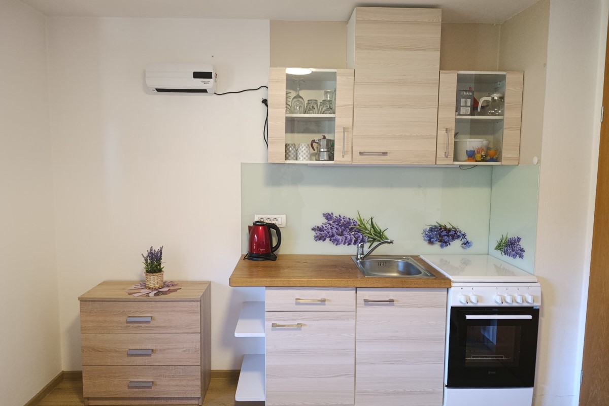 Na voljo so trije apartmaji, dva apartmaja imata polno opremljeno kuhinjo z mikrovalovno pečico, aparatom za pripravo kave, grelnikom vode in hladilnikom, spalnico in kopalnico. En apartma pa ima spalnico z manjšo polno opremljeno kuhinjo in lastno kopalnico na drugi strani skupnega hodnika.